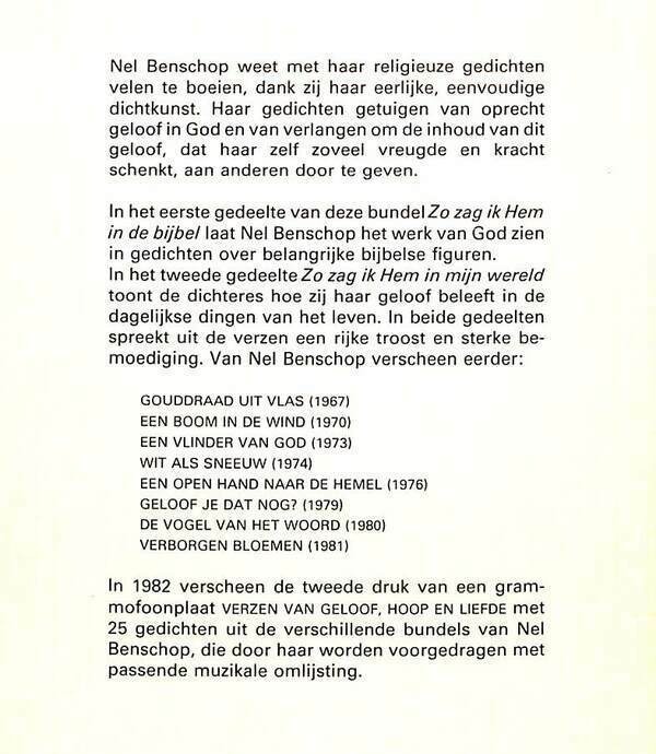 Nel Benschop weet met haar religieuze gedichten velen te ontroeren. Haar in eenvoudige en zuiver Nederlands geschreven poëzie getuigt van een oprecht geloof in god en van het verlangen om de vreugde en de kracht die dit geloof schenkt, door te geven. Talrijke lezers en lezeressen, van alle leeftijden, worden door haar verzen getroost en bemoedigd. Honderdduizenden kochten reeds haar gedichtenbundels: sinds 1970 is Nel Benschop de meest gelezen dichters in Nederland.