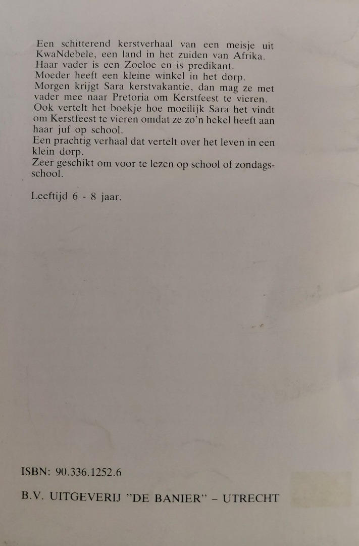 Sara Masuku woont in het J zuiden van Afrika in Kwa- t; C Ndobelo. Ze hooft oen VrW^/ vader met een zwarte, en een moeder met een bruine huidskleur. Zelf is Sara glanzend bruin. Op school krijgt Sara vaak onverdiend straf. Dat komt omdat zo de Heere wil dienen. De juffrouw wil de Heere juist vergeten en straft daarom Sara. Sara voelt haat tegen de juffrouw in haar hart. Maar zo kan Sara geen Kerstfeest vieren. Wat gaat er gebeuren?