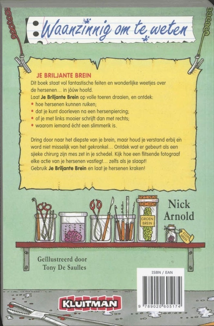 Dit boek staat vol fantastische feiten en wonderlijke weetjes over de hersenen... in jóúw joofd.\nLaat Je Briljante Brein op volle toeren draaien, en ontdek:\n- hoe hersenen kunnen ruiken;\n- dat je kunt doorleven na een hersenpiercing;\n- dat je met links mooier schrijft dan met rechts;\n- waarom iemand écht een slimmerik is.\n\nDring door naar het diepste van je brein, maar houd je verstand erbij en word niet misselijk van het gekronkel.. Ontdek wat er gebeurt als een sjieke chirurg zijn mes zet in je schedel. Kijk hoe een flitsende fotograaf elke actie van je hersenen vastlegt... zelfs als je slaapt!\nGebruik Je Briljante Brein en laat je hersenen kraken!