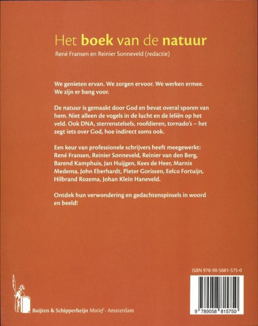 Schrijver-theoloog Reinier Sonneveld en wetenschapsjournalist dr. René Fransen vroegen een aantal schrijvers en wetenschappers hoe zij God beleven in de natuur. Ze nodigden dichters uit, biologen, natuurkundigen, meteorologen, theologen, filosofen. 'Het boek van de natuur' is een full colour boek, met schitterende illustraties en betoverende teksten. Samen vorm de bijdragen een veelstemmig loflied op de schepping en op God.