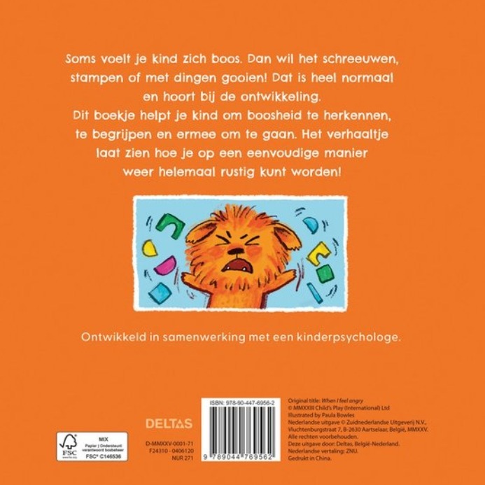Dit kartonboek van uitgeverij Deltas helpt om boze gevoelens te herkennen, te begrijpen en ermee om te gaan. Want soms wil je kind schreeuwen, stampen of zelfs met dingen gooien. Het verhaaltje laat zien hoe je dan op een eenvoudige manier weer helemaal rustig wordt!