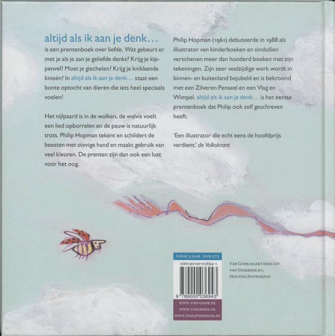 Altijd als ik aan je denk....is een prentenboek over liefde. Wat gebeurt er met je als je aam je geliefde denkt? Krijg je kippenvel? Moet je giechelen? Krijg je knikkende knieën? In altijd als ik aan je denk....staat een bonte optocht van de dieren die iets heel speciaals voelen!