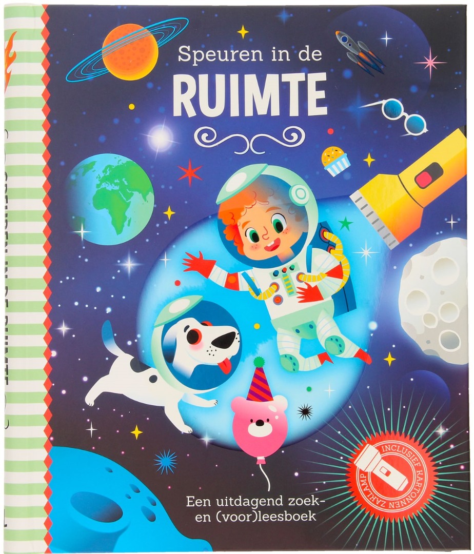 Op een leuke manier leren over de ruimte, dat kan met dit boek! Eerst kun je leren over het onderwerp ruimte, waarna je een verhaal kunt gaan lezen. Met de kartonnen zaklamp kun je de rechterpagina's op laten lichten, zodat je kunt zien wat erop staat! Dit interactieve boek is super leuk voor kleine toekomstige astronauten!