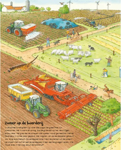 Sla snel dit leuke zoekboek open en maak kennis met het leven op de boerderij! Er is in elk seizoen wat te doen: het veld omploegen, groenten oogsten, schapen scheren, strobalen persen, koeien melken, sneeuwruimen… Kortom, op elke plaat is heel veel te ontdekken. Bovendien leer je de dieren van de boerderij kennen, zie je al het lekkers dat de boer verbouwt en kom je te weten welke machines hem daarbij helpen.