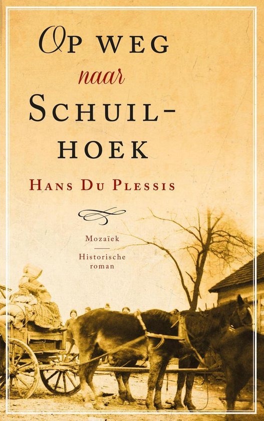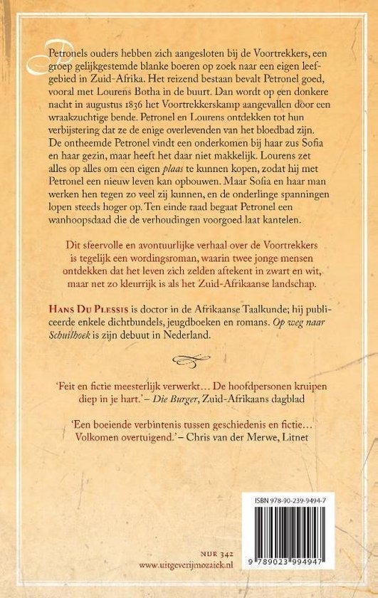 Petronels ouders hebben zich aangesloten bij de Voortrekkers, een groep gelijkgestemde blanke boeren op zoek naar een eigen leefgebied in Zuid-Afrika. Het reizend bestaan bevalt Petronel goed, vooral met Lourens Botha in de buurt. Dan wordt op een donkere nacht in augustus 1836 het Voortrekkerskamp aangevallen door een wraakzuchtige bende. Petronel en Lourens ontdekken tot hun verbijstering dat ze de enige overlevenden van het bloedbad zijn. De ontheemde Petronel vindt een onderkomen bij haar zus Sofia en haar gezin, maar heeft het daar niet makkelijk. Lourens zet alles op alles om een eigen 'plaas' te kunnen kopen, zodat hij met Petronel een nieuw leven kan opbouwen. Maar Sofia en haar man werken hen tegen zo veel zij kunnen, en de onderlinge spanningen lopen op. Ten einde raad begaat Petronel een wanhoopsdaad die de verhoudingen voorgoed laat kantelen. Dit sfeervolle en avontuurlijke verhaal over de Voortrekkers is tegelijk een wordingsroman, waarin twee jonge mensen ontdekken dat het leven zich zelden aftekent in zwart en wit, maar net zo kleurrijk is als het Zuid-Afrikaanse landschap. Hans Du Plessis is doctor in de Afrikaanse Taalkunde; hij publiceerde enkele dichtbundels, jeugdboeken en romans. 'Op weg naar Schuilhoek' is zijn debuut in Nederland.