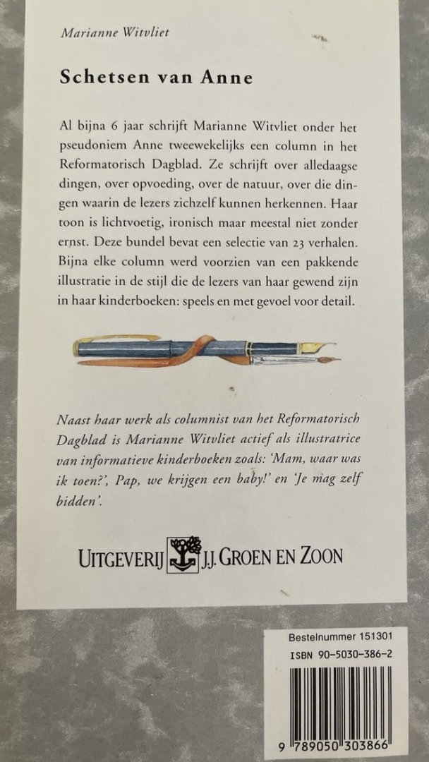 Marianne Witvliet schrijft onder het pseudoniem ‘Anne’ tweewekelijks een column in het Reformatorisch Dagblad. Het is een luchtige column, waarin ze allerlei anekdotes vertelt uit haar leven als moeder van een groot gezin. Dit bundeltje van 23 columns geeft een goede indruk van een wereld waarin veel aandacht wordt verleend en betekenis ontleend aan de kinderen, het familieleven, de opvoeding, het huishouden, het geloof en de natuur. Ook de speelse tekeningen die de columns vergezellen, zijn van de schrijfster. Verzorgd omslag met aquarel in kleur van alweer Marianne Witvliet. Een bundeltje dat vooral in eigen kring herkenning zal oproepen