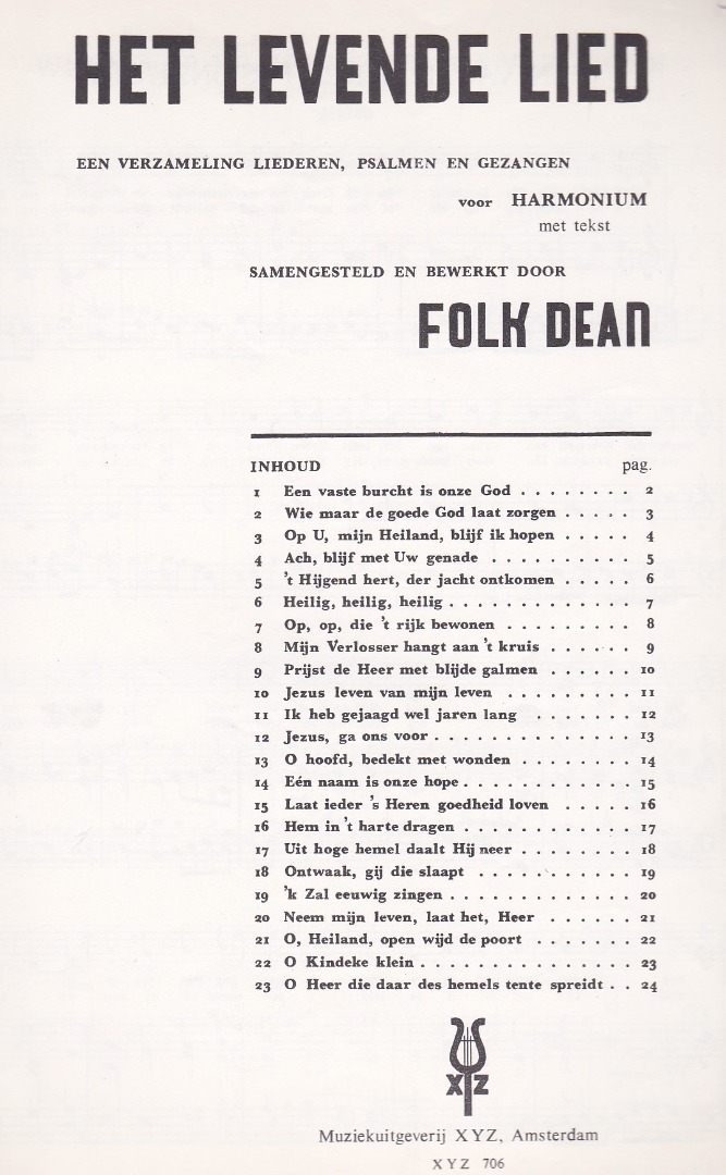 Verzameling Liederen, Psalmen en Gezangen voor orgel met tekst samengesteld en bewerkt door Folk Dean. Pracht om naast je orgelmethode bekende liederen, psalmen en gezangen te spelen