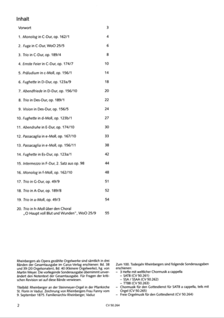 Een verzameling van 20 kortere orgelwerken. Rheinberger schreef geen orgelmuziek voor de eredienst. Deze uitgave bundelt trio's, fughetta's, passacaglia's en karakterstukken uit Rheinbergers omvangrijke oeuvre voor orgel. Vanwege hun lengte en moeilijkheidsgraad zijn ze geschikt voor liturgisch orgelspel, waar ze als prelude, intermezzo en postlude gespeeld kunnen worden. De verzameling beoogt dan ook Rheinbergers orgelmuziek meer bekendheid te geven binnen de liturgie.