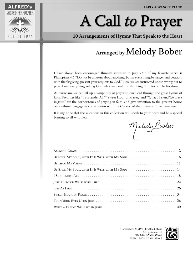 A Call to Prayer bevat 10 favoriete hymnes, vakkundig gearrangeerd voor piano van gevorderden en gevorderden door Melody Bober.