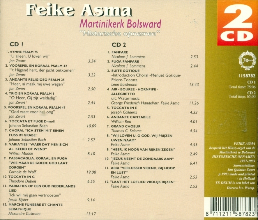 Als nieuwe dubbel-cd Feike Asma met historische orgelopnamen, een juweeltje! Voor inhoud van deze 2cd's zie de afbeeldingen bij dit artikel. Echt twee bijzondere cds met pracht inhoud!