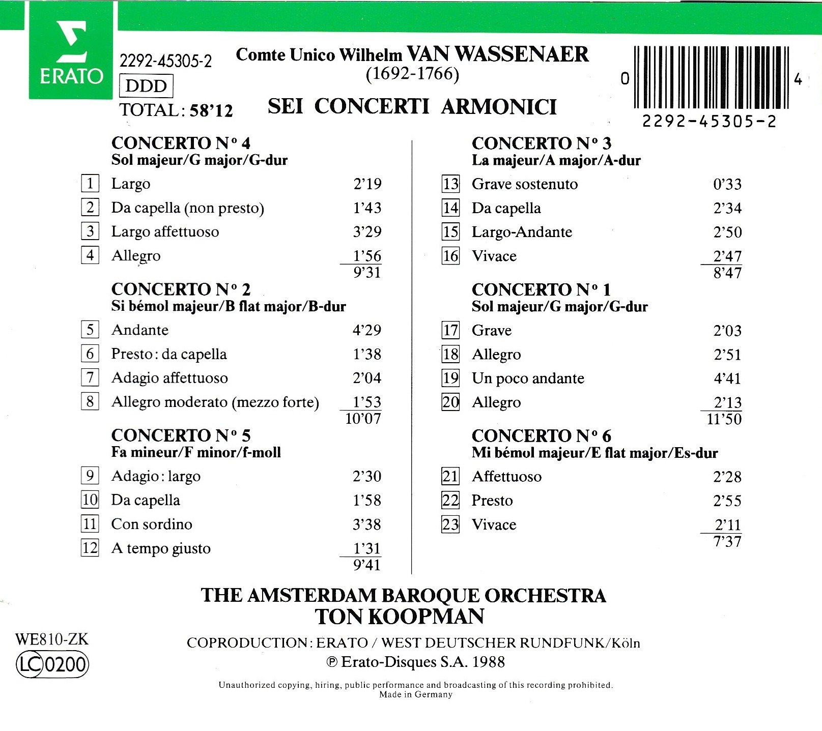 Koopman, Ton - Van Wassenaer 6 Concerti Armonici