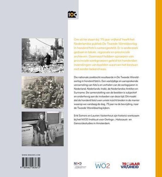 De oorlogsjaren komen steeds verder van ons af te staan. Althans, chronologisch. Emotioneel gezien is de oorlog nog steeds dichtbij. Dan zijn het vooral de beelden die het verleden zichtbaar en voorstelbaar maken. De Tweede Wereldoorlog in 100 foto’s is een nationaal project in het kader van 75 Jaar Vrijheid. Inwoners van Nederland zijn uitgenodigd om op uiteenlopende wijze te participeren. In eerste instantie per provincie en daarna op landelijk niveau, zijn de meest aansprekende foto’s van Nederland, Nederlands-Indië, Suriname en de Nederlandse Antillen tijdens de Tweede Wereldoorlog bijeengebracht. Vertegenwoordigers uit alle geledingen van de samenleving hebben vervolgens De Tweede Wereldoorlog in foto’s samengesteld. Een verzameling die visueel aantrekkelijk is, maar vooral bestaat uit foto’s die hun zegginsgskracht ontlenen aan de indringende verhalen die erachter schuil gaan. De Tweede Wereldoorlog in 100 foto’s geeft een veelzijdig en verrassend beeld van hoe de Nederlandse samenleving terugkijkt op de jaren van oorlog, beztting en onderdrukking.