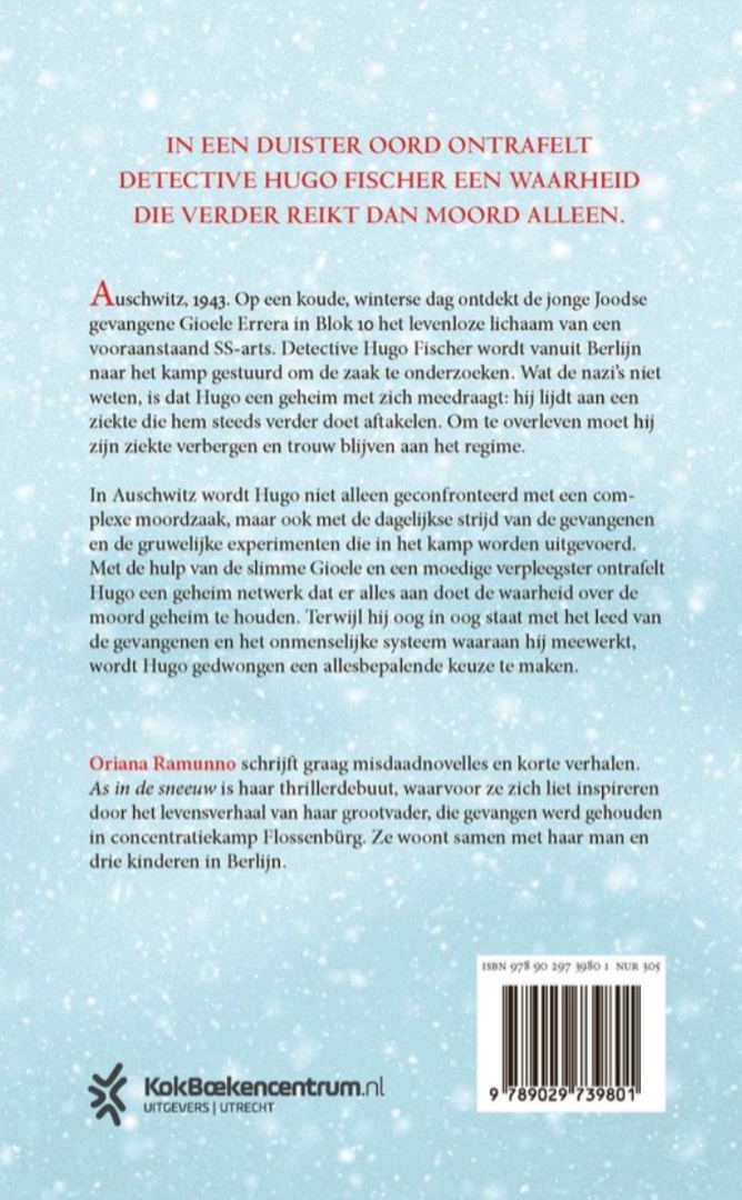 'As in de sneeuw' van Oriana Ramunno is geïnspireerd op het verhaal van haar grootvader, die gevangen zat in concentratiekamp Flossenbürg. Een indringende thriller over menselijkheid in tijden van onmenselijkheid – en de prijs van verzet.