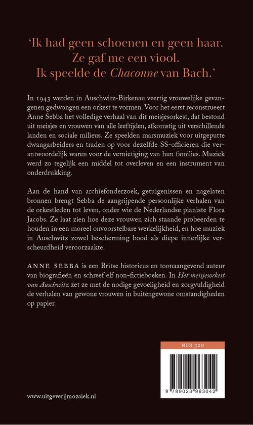 Welke rol kon muziek vervullen in een vernietigingskamp? Hoe was het voor deze vrouwen om deel uit te maken van een orkest dat niet alleen diende als propagandamiddel, maar ook troost bood aan de moordenaars van hun familie en vrienden? Sebba baseert zich op uitgebreid archiefonderzoek en gesprekken met overlevenden, waaronder met de Nederlandse pianiste Flora Jacobs. Zo probeert ze een antwoord te vinden op deze aangrijpende vragen en laat ze zien hoe muziek in Auschwitz zowel een middel tot overleven als een pijnlijke vorm van onderdrukking werd.
