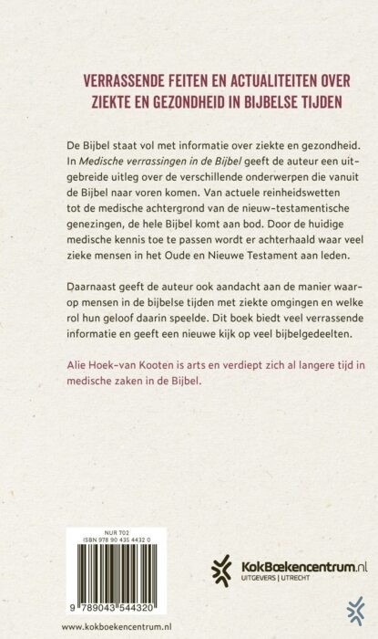 'Medische verrassingen in de Bijbel' van Alie Hoek-van Kooten biedt een nieuwe kennismaking met ziekte en gezondheid in de Bijbel. In de Bijbel staat verrassend veel informatie over gezondheid en ziekte, vanuit het oude testament komen veel regels naar voren om ziekte en de verdere verspreiding van ziekte te voorkomen. Veel van deze regels zijn nog steeds actueel en in dit boek wordt er uitgelegd waar deze regels vandaan komen en hoe deze in de moderne wetenschap worden toegepast. Van oud-testamentische narcose tot het nut van de reinheidswetten, de auteur loopt de bekende en minder bekende medische gebeurtenissen in de Bijbel langs. Daarnaast geeft Alie Hoek-van Kooten ook aandacht aan de manier waarop mensen in de bijbelse tijden met ziekte omgingen en welke rol hun geloof daarin speelde. Een nieuwe invalshoek op bekende materie, toegankelijk en verrassend.