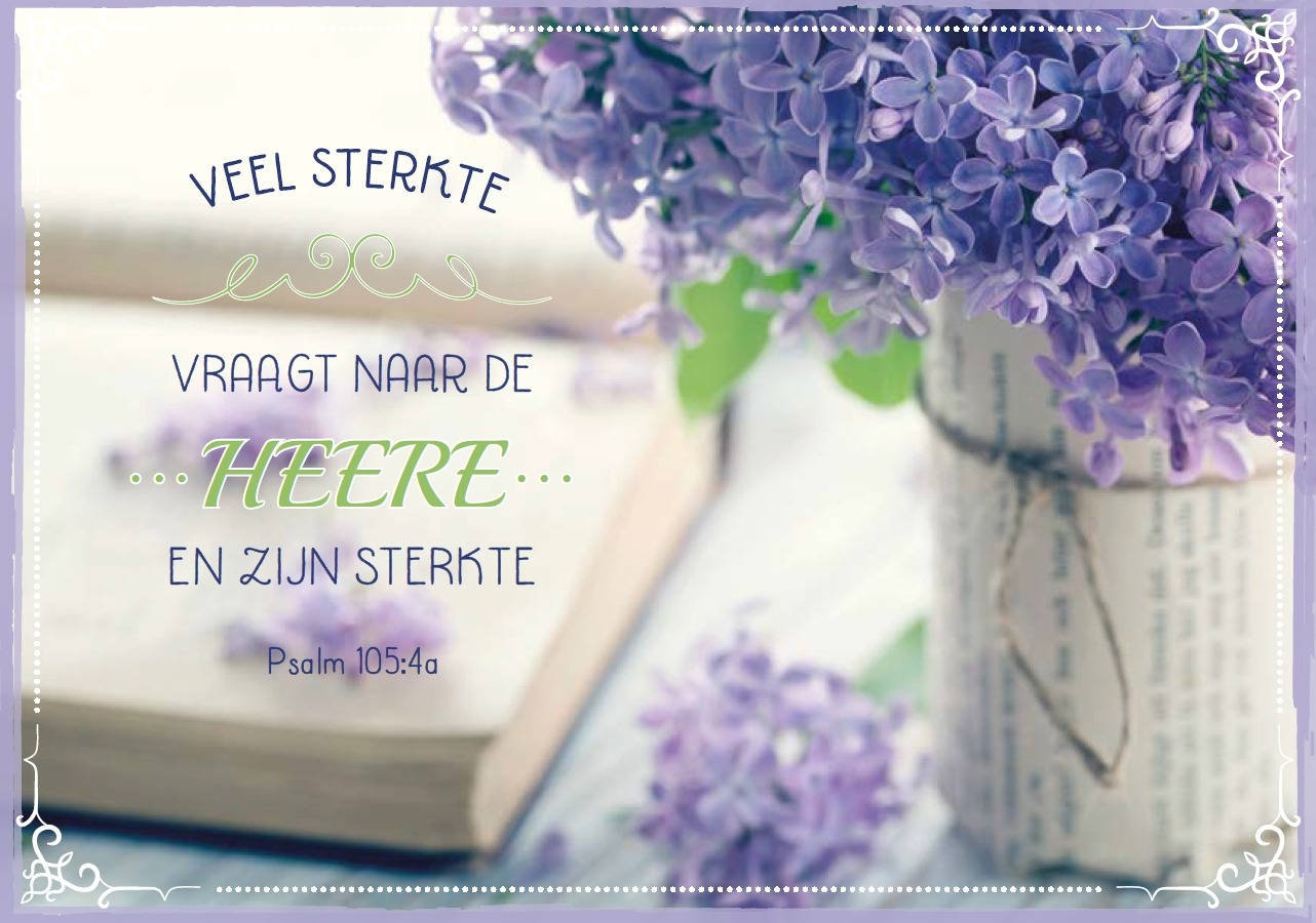 Prentbriefkaart Veel SterkteBijbeltekst voorzijde:Vraagt naar de HEERE en Zijn sterkte.Psalm 105:4aFormaat 148 x 105 mm