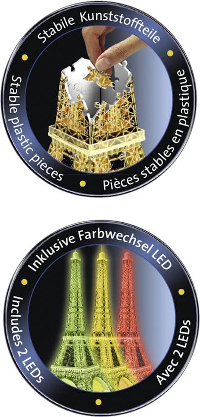 Uniek drie dimensionaal puzzelplezier, dat zijn de 3D gebouwen puzzels van Ravensburger! Puzzel prachtige 3D bouwwerken in elkaar en geef ze een mooi plaatsje op o. a. je wandplank of op het dressoir! De stevige plastic stukjes passen precies in elkaar. Zo bouw je vanuit gebogen, platte en opvouwbare stukjes een uniek model van de Eiffeltoren, zonder lijm te gebruiken!