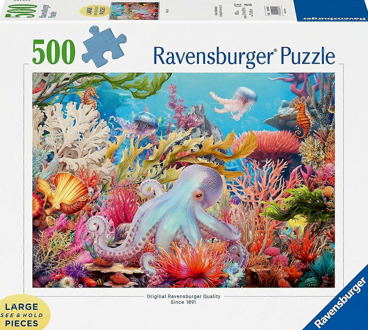 Ontdek de kleurrijke onderwaterwereld met de Ravensburger "Koraalrif" XL-puzzel van 500 extra grote stukjes. Vol details zoals kwallen, zeepaardjes en een vriendelijke octopus, meet de voltooide puzzel 61 x 46 cm en is geschikt vanaf 10 jaar. Gemaakt van stevig karton met linnenstructuur en voorzien van Ravensburger’s Softclick-technologie voor perfect passende stukjes. Ideaal voor ontspanning, mindfulness en uren puzzelplezier voor jong en oud.