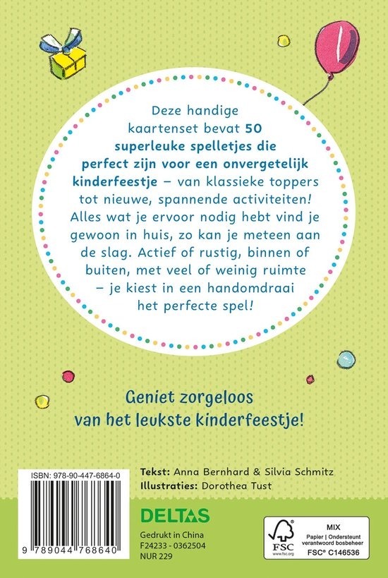 Deze kaartenset van Deltas bevat 50 superleuke spelletjes die perfect zijn voor een onvergetelijk kinderfeestje - van klassieke toppers tot nieuwe, spannende activiteiten! Alles wat je ervoor nodig hebt, vind je gewoon in huis, zo kan je meteen aan de slag. Op elke kaart staan handige icoontjes met informatie over de leeftijd, voorbereidingstijd en speelplek. Actief of rustig, binnen of buiten, met veel of weinig ruimte - je kiest in een handomdraai het perfecte spel! Geniet zorgeloos van het leukste kinderfeestje!
